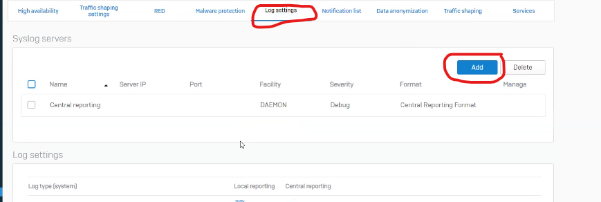 2.2 Select Log settings and click Add to configure a Syslog server.
