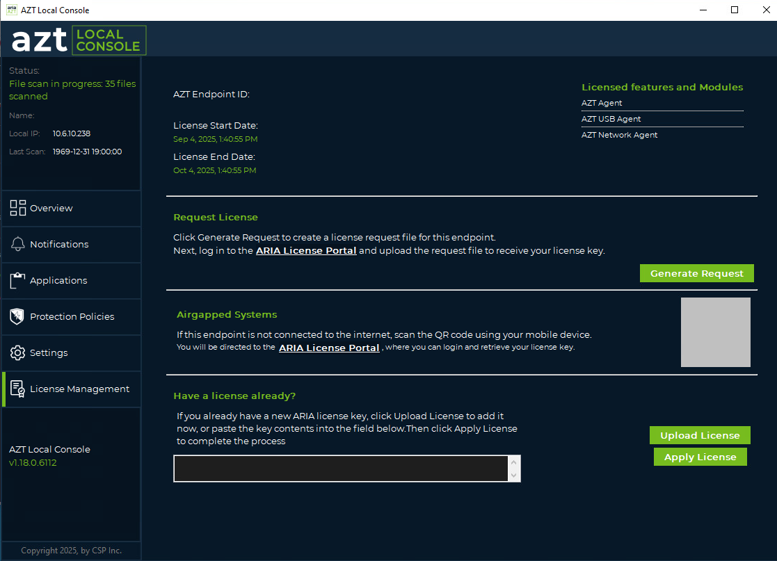 - Once you receive the license file, in the AZT Local Console, click the Upload License button and then Apply License to apply the license.