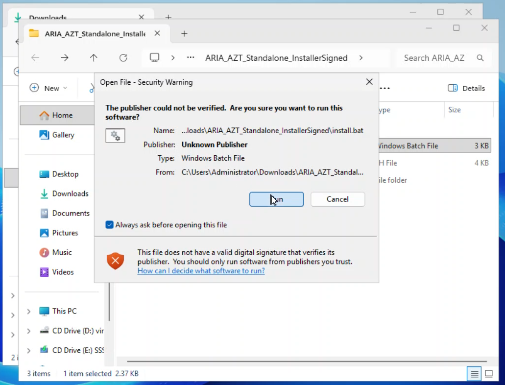 - On the Security Warning, select Run to proceed. This will kick-off the install process. The AZT Local Console will be installed once the installer is finished.