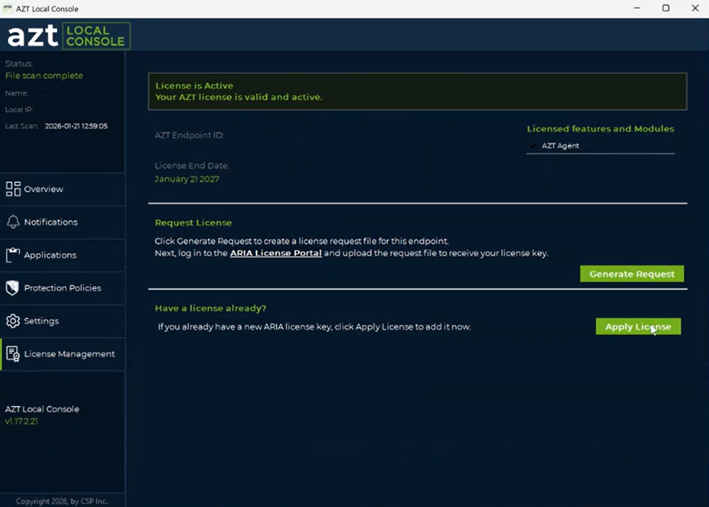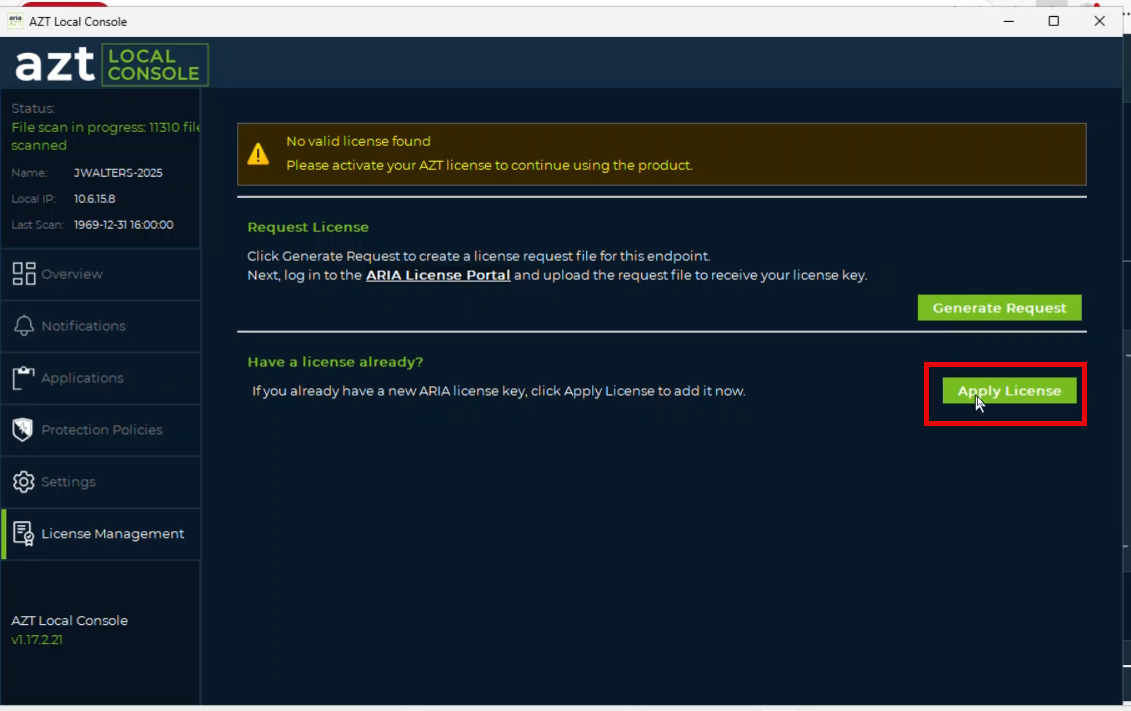 - Once you have the license file, go back to AZT Local Console. Click Apply License to apply the license.