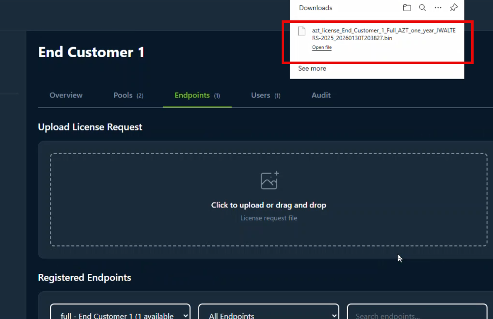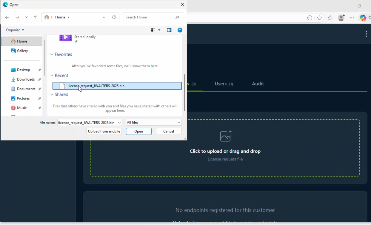 - On the Endpoints tab, upload your license request .bin file to the uploader. Select Open.