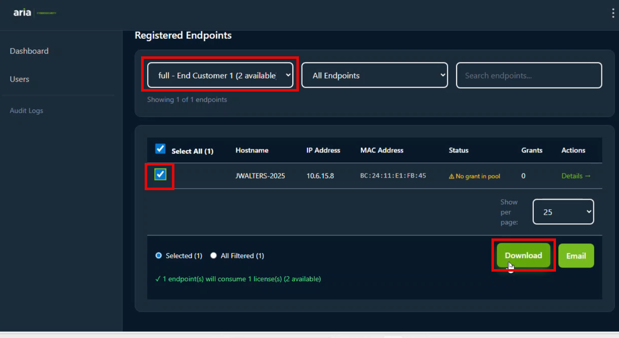 - Select the license pool and endpoint(s) you would like to generate licenses for. Select Download to download the file to your computer or Email to send it to your email.