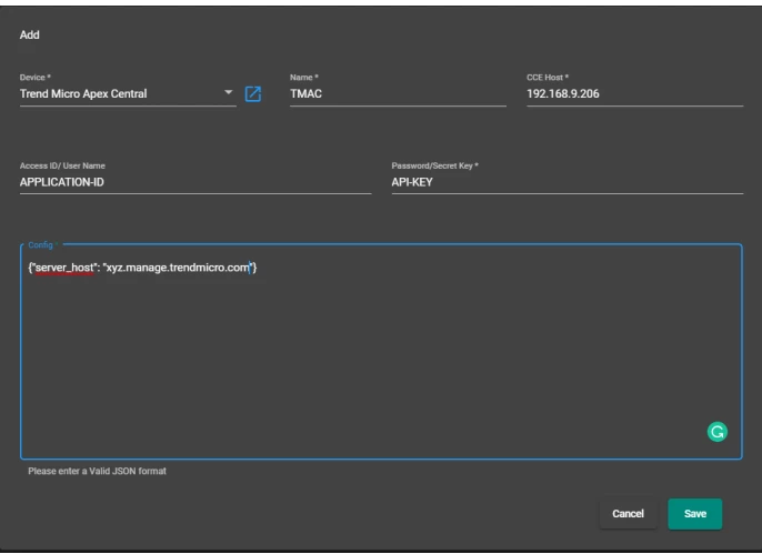- In the final field, enter a valid JSON configuration. Use the Trend Micro domain URL as shown below: