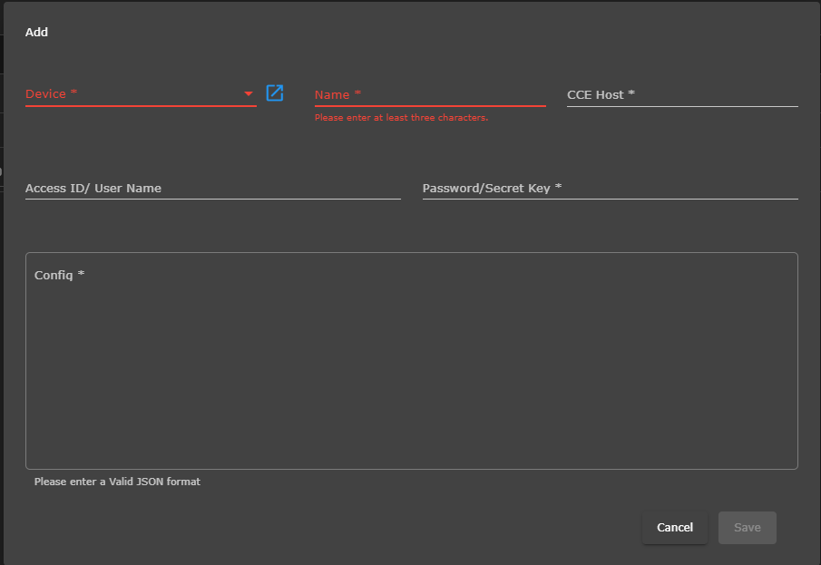 Now invalid JSON Format in the last field, enter config as e.g. { "host": "Value", "org_key": "1234abc" }