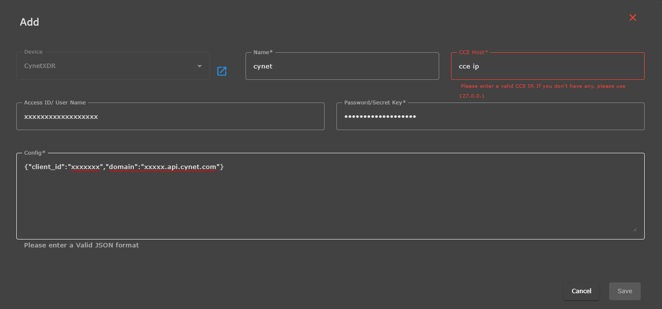 { "clientid": "xxxxxxx", "domain": "yourdomain.api.cynet.com" } - Click Save to complete configuration.