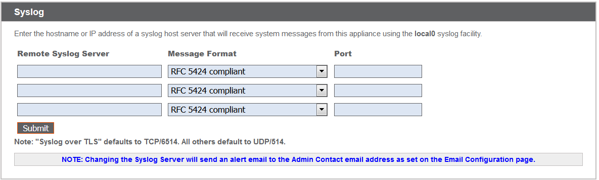 ⚠️ Note: When you add or change a syslog server configuration, an alert is automatically emailed to the administrator.